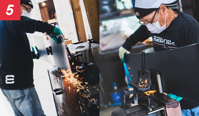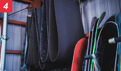 約20以上あるサンディングベルトの中から、各工程に合わせたベルトをチョイスして何回も何回もベルトをチェンジしながら削り、磨き込んでいきます。